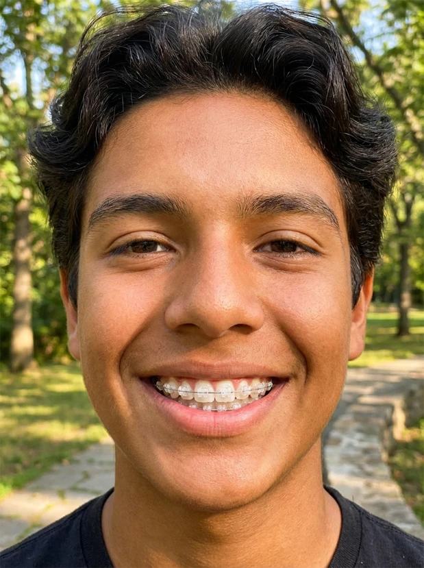 Clear braces use brackets made from tooth‑colored or translucent ceramic, instead of stainless steel. They’re translucent or matched to natural enamel shades, making them harder to spot from a distance. The wire can be standard metal or coated to blend in more.